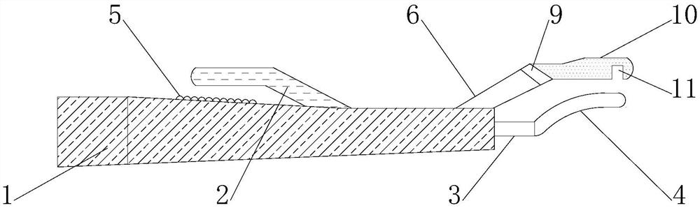 | 摘要: | 本实用新型公开了一种用于糖尿病足顽固趾甲修剪的探舌工具,包括握柄、手柄、连接杆、舌板、凸块、固定杆、固定板、弹簧、连接块、限位杆和卡槽。本实用新型结构简单,操作方便,通过采用弯折状结构的舌板有利于分离糖尿病患者的足趾甲和皮下组织,在进行修剪时能够有效避免因修甲剪操作时导致患者足部受伤的问题,避免因误操作导致患处感染而引发二次受伤的问题;本实用新型通过采用限位杆的设置能够在使用修甲剪修剪时进行限位,避免使用修甲剪时发生偏移的问题,有效避免因修剪时修甲剪的歪斜而造成受伤的问题,有利于配合修甲剪进行使用。 | ||||
