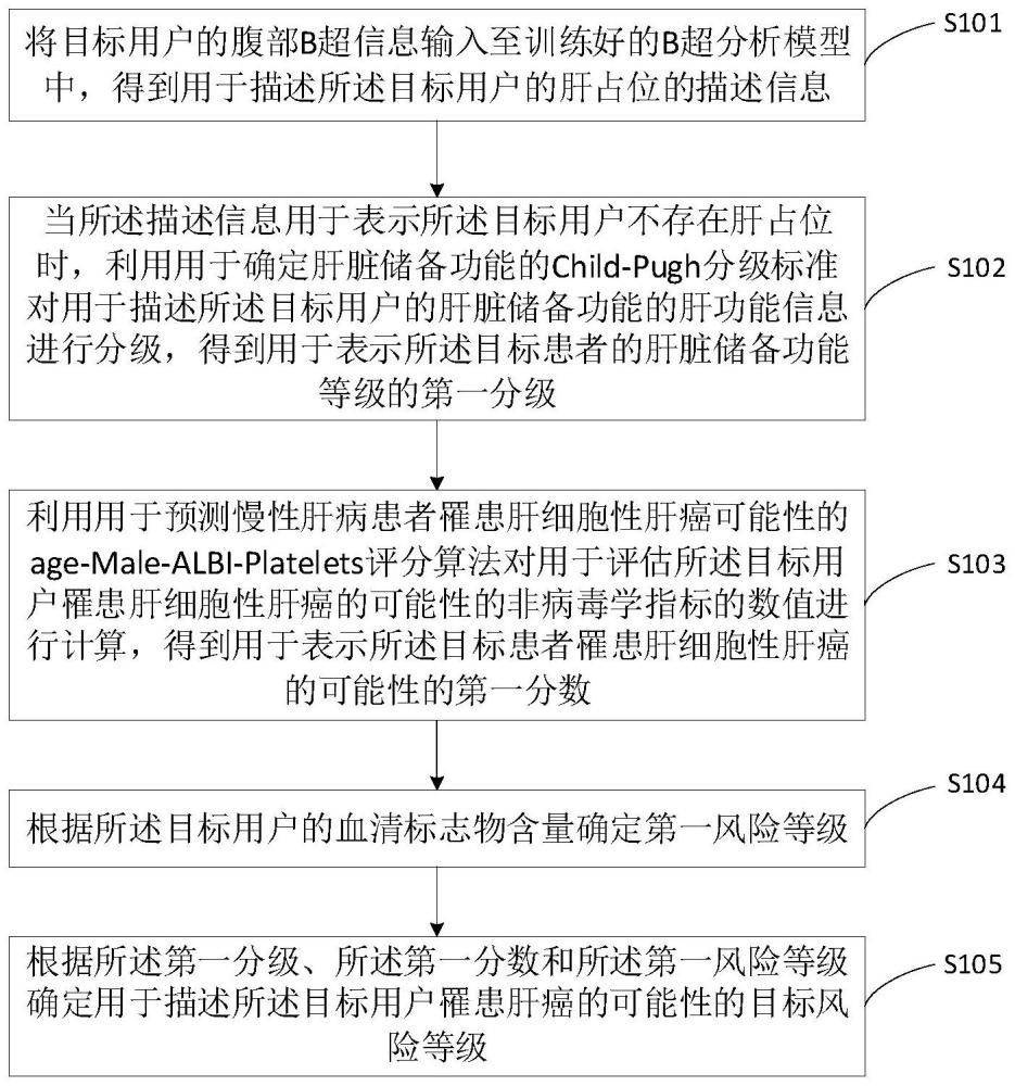 | 摘要: | 本申请提供了一种风险等级确定方法、装置、计算机设备及存储介质,其中,将用户的腹部B超信息输入至B超分析模型中,得到用户的肝占位的信息;利用Child‑Pugh分级标准对用户的肝脏储备功能的肝功能信息进行分级,得到用于表示目标用户的肝脏储备功能等级的第一分级;利用age‑Male‑ALBI‑Platelets评分算法得到用于表示目标用户罹患肝细胞性肝癌的可能性的第一分数;根据目标用户的血清标志物含量确定第一风险等级;根据第一分级、第一分数和第一风险等级确定用于描述用户罹患肝癌的可能性的目标风险等级。采用上述方法,对用户各项身体指标进行分析,以提高风险等级确定的准确性。 | ||||