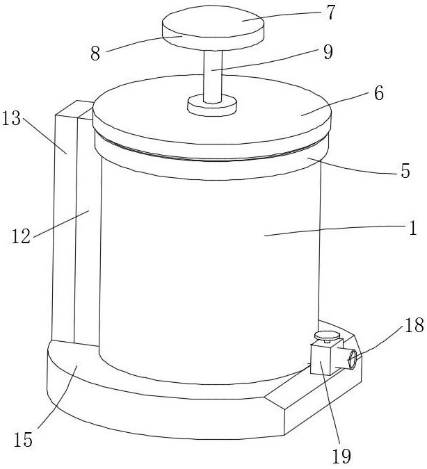 | 摘要: | 本实用新型公开了一种中药科用中药残渣压榨装置,包括压榨筒,所述压榨筒的顶部外壁固定连接有搭放圈,且搭放圈的顶部外壁开有搭放槽,搭放槽的侧面内壁搭放有放置于压榨筒内部的兜筒,兜筒的侧面外壁底部和底部外壁均开有滤孔,兜筒的内部设置有下压机构,所述压榨筒的一侧外壁固定连接有泵壳,且泵壳的侧面内壁固定连接有微型泵,微型泵的进液端固定连接有插接于压榨筒侧面外壁底部的抽液管,微型泵的出液端连接有进液管。本实用新型能对中药残渣进行清洗,使得中药残渣处理的更加彻底,使得中药残渣接受清水清洗更加均匀彻底,防止药液中夹杂的细小中药残渣进入下方的药液中,提高了药液的纯净度。 | ||||