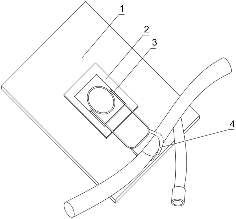 | 摘要: | 本实用新型公开了一种尿管固定装置,属于医疗技术领域,包括基础层和过渡层,过渡层的中心处设置有连接组件,连接组件的一端系有布绳,连接组件包括底板、弹片、横轴、半球座、金属框和偏心块,本实用新型提出的一种尿管固定装置,基础层通过黏贴连接过渡层,其中整个基础层和过渡层粘贴在在患者的大腿上,过渡层通过连接组件连接布绳,布绳套在尿管尾端的分叉处,这样尿管尾端得到了有效定位,避免其晃动,其中弹片能迫使偏心块处于偏转状态,偏心块就会迫使横轴及其连接的金属框处于偏转状态,此时金属框的尾端与基础层的外壁接触,布绳套住尿管尾端,尿管尾端得到了有效定位,避免其晃动,同时金属框的位置调节方便,实用性好。 | ||||