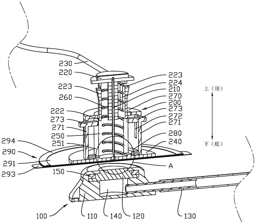 | 摘要: | 本发明公开了一种输液装置及使用方法,输液装置包括:输液港组件,包括注射座、穿刺隔膜和导管;无损伤针组件,包括无损伤针体、指压按钮、输液延长管、底座、内护筒和压缩弹簧,内护筒设于底座上,底座上设有连通于内护筒内部的避让孔,指压按钮上设有插设于内护筒内部的延伸部,延伸部与内护筒之间设有防脱结构和可解锁的锁定结构,压缩弹簧设于指压按钮和底座之间,按压指压按钮完成穿刺操作后可通过锁定结构限制指压按钮移动,解锁锁定结构时压缩弹簧能够驱使指压按钮移动以使无损伤针体的头部收缩于内护筒内部;磁吸结构,设于注射座和底座之间。上述的输液装置有利于降低穿刺操作的难度并且有利于防止医护人员在拔除无损伤针时被刺伤。 | ||||