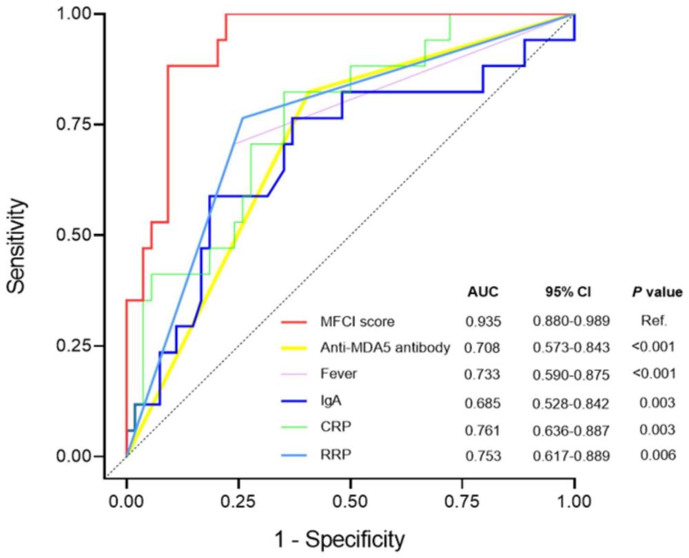 | 摘要: | 本发明公开了一种预测初诊皮肌炎患者发生快速进展型间质性肺病的风险模型的构建方法,属于医学领域。包括以下步骤:S1:获取初诊皮肌炎患者的临床资料;S2:利用差异分析检测初诊皮肌炎发生快速进展型间质性肺病患者及初诊皮炎肌未发生快速进展型间质性肺病患者中的变量;S3:利用单变量和多变量逻辑回归分析确定与初诊皮肌炎生快速进展型间质性肺病的相关变量,建立风险模型;所述风险模型包括利用抗MDA5抗体、发热、IgA和CRP评分。本发明通过ROC分析,该风险模型可以准确的在早期预测初诊皮肌炎患者发生快速进展型间质性肺病的风险。 | ||||