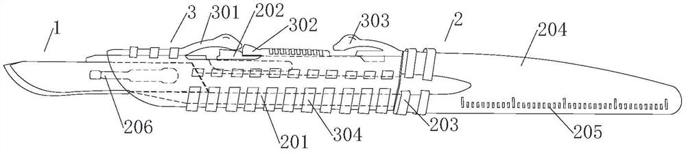 | 摘要: | 本实用新型公开了一种新型带保护套的手术刀,包括刀片、塑料刀柄和保护套,还包括前刀柄、翘片、刀柄仿滑凸起、后刀柄、刻度尺、刀片安装块、前凸起、挡板、后凸起和防滑凸起;该手术刀创新性的将刀片与塑料刀柄紧密连接,再通过安装一个透明塑料的保护套,在使用时,通过按住保护套上的前凸起,将塑料刀柄的翘片按下后,可将保护套向前推直到覆盖刀片后,翘片持续被挡板压住,然后翘片弹回被后凸起挡住,实现保护套对刀片的阻挡。保护套回收可通过后凸起按住翘片,保护套向后移动完成,并为了提高使用安全性,在保护套上设计了多个防滑凸起,保护套能对刀片起到很好的保护作用,并且能减少医生在手术当中造成的误伤害,进一步保护医生的安全。 | ||||