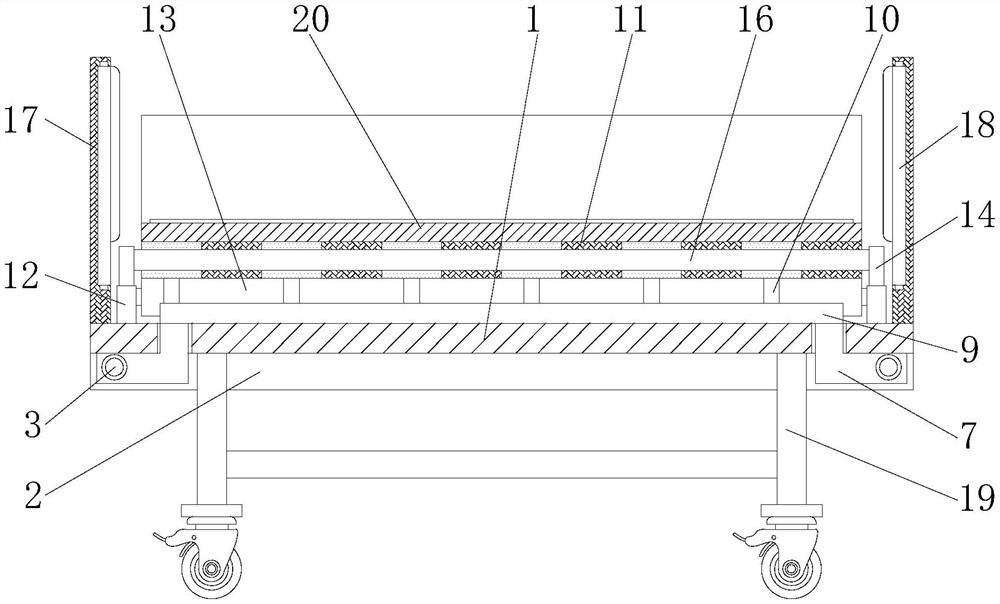 | 摘要: | 本实用新型公开了一款伸缩式病床,包括支撑板,所述支撑板底部的前侧和后侧均固定连接有固定板,所述固定板的后侧贯穿设置有双向螺纹杆,所述双向螺纹杆的后端固定连接有转盘,所述转盘之间传动连接有皮带,双向螺纹杆表面的前侧和后侧均螺纹套设有L形块,支撑板顶部的两侧均开设有第一通孔,L形块的顶部贯穿第一通孔并固定连接有活动杆。本实用新型通过设置双向螺纹杆、转盘、皮带、转把、L形块、第一通孔、活动杆、连接块、床板、连接板、第二通孔和限位杆的配合使用,具备伸缩功能的优点,解决了现有的病床不具备伸缩功能,在对病床进行移动时,可能会因为病房和检测室等门框限制,不便于对病床进行移动的问题。 | ||||