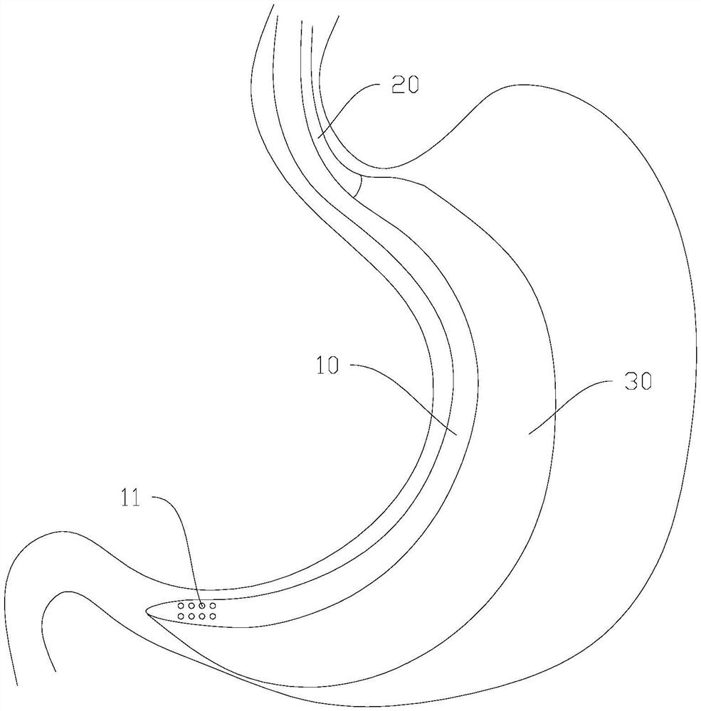 | 摘要: | 本实用新型公开了一种胃切除术中辅助装置,包括柔性的第一管道,第一管道的第一端设有通孔,第一管道的第二端具有第一通道口,第一管道的第一端外侧设有气囊,气囊沿第一管道的长度方向延伸布置;柔性的第二管道,第二管道贴接在第一管道的侧壁上,第二管道的长度方向平行与第一管道的长度方向,第二管道的第一端与气囊连通,第二管道的第二端具有第二通道口。通过将第一管道的第一端和第二管道的第一端伸入胃中,胃内的胃液通过通孔流入第一管道被排走,然后向第二管道通入气体使气囊膨胀,气囊膨胀后使胃壁隆起并在腹腔镜下显形,有助于医生切割出形状规则的胃袋,保证剩余胃袋的容积合适,胃袋的成型效果更好。 | ||||