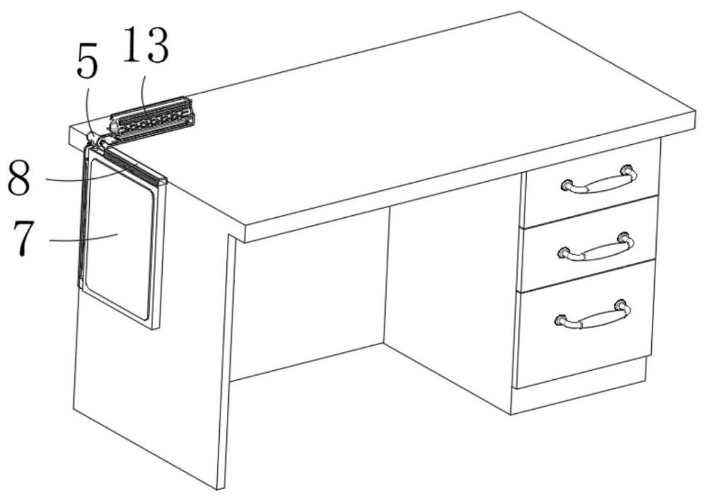 | 摘要: | 本发明提供一种影像科用观片设备及其使用方法,属于影像观片设备技术领域。包括第一安装板,第一安装板的一端固定连接有第二安装板,第二安装板的一端固定连接有第一转轴,第一转轴外转动连接有安装套,安装套的外壁上固定连接有第二转轴,第二转轴的一端固定连接有L型安装架,L型安装架的内壁上螺接有观片灯;定位组件用于定位和缓冲观片灯,夹持组件用于夹持固定胶片。本发明通过设置定位组件,使得观片灯可以收纳到办公桌的侧边,在观片灯不被使用时收纳起来不仅占地空间更小,而且使得观片灯不易被磕碰撞损,当需要使用观片灯时,使用者需要把观片灯旋入到办公桌上。 | ||||