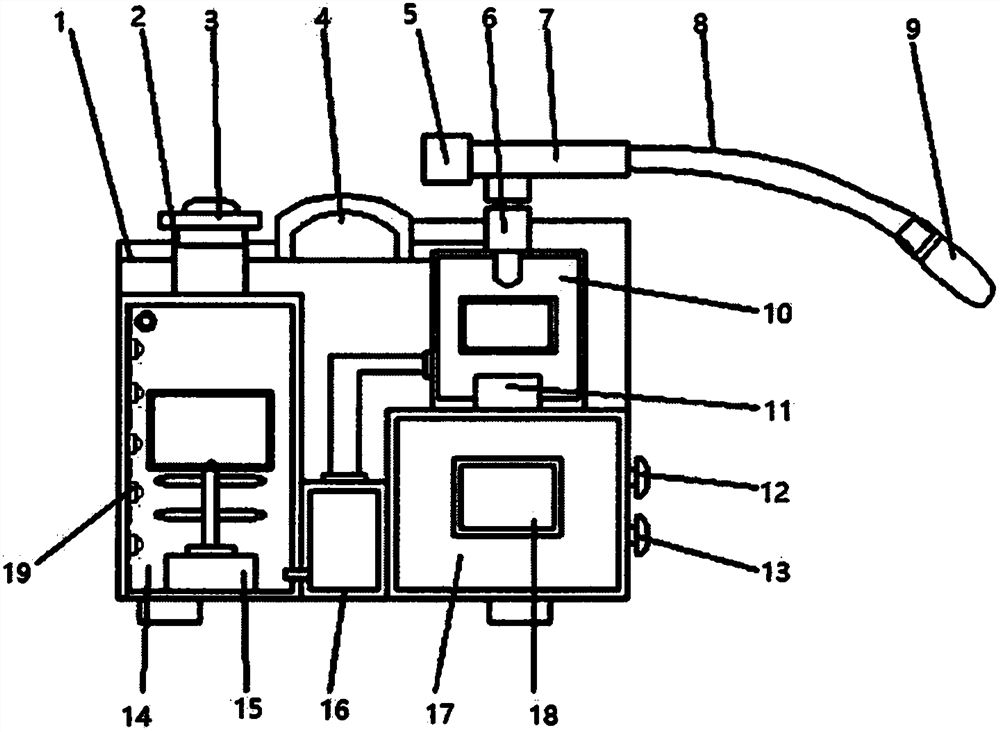 | 摘要: | 本实用新型公开一种雾化装置,包括设置于雾化装置主体内的药剂箱、超声波雾化机构和雾化腔,药剂箱的顶部设有加药口,侧壁设置有若干药剂注射口,药剂箱通过安装有增压泵的导管与雾化腔连通,雾化腔安装在超声波雾化机构的顶部;雾化腔的出口通过喷雾通道与安装有喷雾头的软管连接;药剂注射口的内侧壁设置有药液流入管和旋转挡板,旋转挡板的底端通过销轴设置于药剂箱的内侧壁且位于药液流入管的出口下方,旋转挡板的内侧面通过一根连杆连接有浮球,该浮球浮于药液顶面。该雾化装置,具有可控制雾化药液的剂量的优点,同时还可以根据需求调节喷雾的大小,便于针对患者的不同情况进行针对性喷雾治疗,进而提高了喷雾治疗的效果。 | ||||