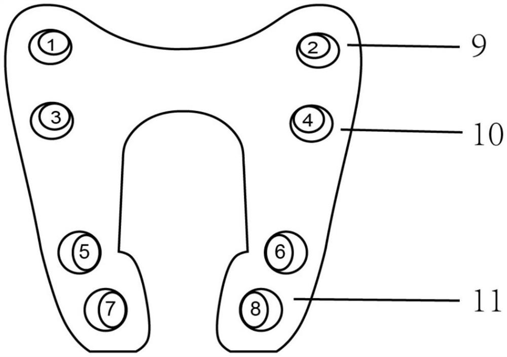 | 摘要: | 本实用新型涉及一种颈前路枕骨髁固定装置。本实用新型所述的颈前路枕骨髁固定装置为一体成型的三段结构,包括:上段的枕骨髁固定部,中段的寰椎固定部,以及后段的枢椎固定部;枕骨髁固定部的上端部形成为向内的弧形,左侧形成为朝向左后方的弧面,右侧形成为朝向右后方的弧面,以致使枕骨髁固定部适合贴紧人体颈前路枕骨髁;寰椎固定部是水平的,向两侧延伸形成分叉,再向后延伸形成枢椎固定部;寰椎固定部与枢椎固定部形成一定的角度,以致使枢椎固定部适合贴紧人体颈2椎体。本实用新型所述的颈前路枕骨髁固定装置具有较高的稳定可靠性,手术创伤更小,减少手术暴露,术后并发症更少。 | ||||