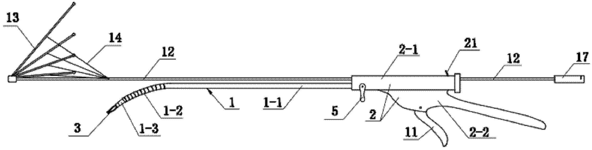 | 摘要: | 本发明涉及一种单孔腹腔镜下行脾脏切除手术的肝胃牵开装置,该牵开装置由把手(2)和设在把手(2)上的牵拉胃的牵开器及拨开肝脏的承托器组成,其中,所述的牵开器由具有轴向中心孔的操作杆1、多节杆1-2弯曲控制机构、夹持钳(3)和夹持钳(3)张开和闭合控制机构组成;所述的承托器由承托伞、承托伞的收拢和撑开机构以及逆止控制机构组成。本发明的牵开装置可同时进行拨开肝脏和牵拉胃的操作,显著减少了手术时伸入腹腔镜孔中的手术器械数量。 | ||||