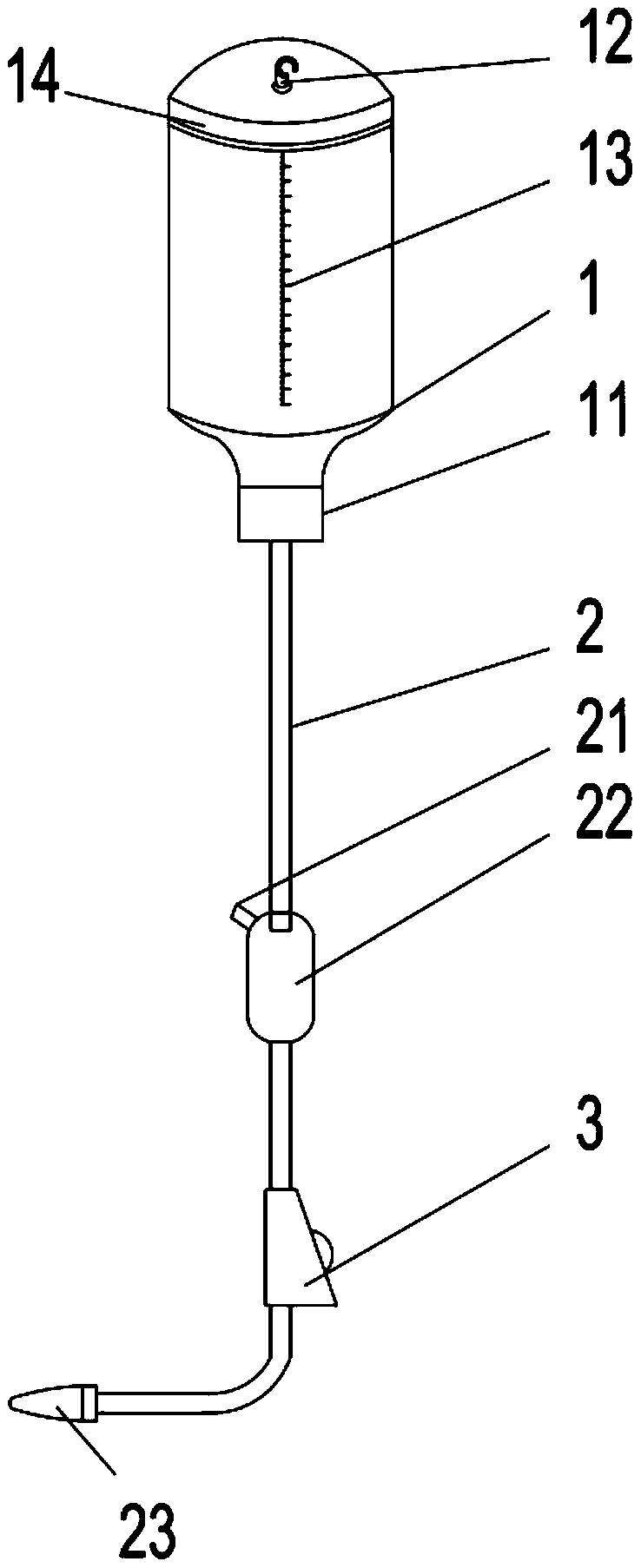 | 摘要: | 本实用新型属于医疗用品领域,提供了一种重力滴注鼻饲装置,包括用于装置食物的鼻饲桶和与鼻饲桶连接的连接管,所述连接管的一端设置有用于插入临床上现有的鼻饲液进行可拆卸连接或插入鼻饲桶与鼻饲桶可拆卸连接的第一连接头并且连接管另一端设置有用于与患者处固定的胃管可拆卸连接的第二连接头,所述连接管上还设置有用于对滴注速度进行观察的滴壶,所述第一连接头和滴壶间的连接管上还设置有排气管,所述连接管上还设置有用于对滴注速度进行控制的调节器,所述连接管管径为0.6‑0.7cm。本实用新型便于清洗且不但营养液输送方便并且病人自制较浓稠的食物也能够输送。 | ||||