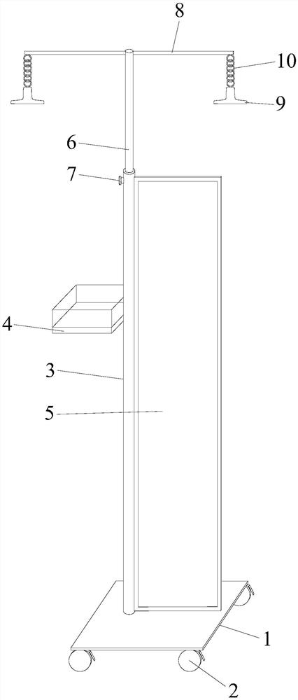 | 摘要: | 本实用新型公开了一种隔离衣床旁放置架,包括底板,所述底板的顶部安装竖杆,竖杆的一侧固定有免洗洗手液置放台,竖杆的另一侧固定有镜子,竖杆的上端安装有升降杆和控制升降杆升降的开关,升降杆的上端固定有横杆,横杆的两端连接有隔离衣夹。本实用新型的隔离衣床旁放置架可使隔离衣与患者所在床单位有间隔,避免隔离衣与病床接触造成污染,可随时观察是否存在污染,及检查穿戴是否准确,且能方便便捷地实现手卫生。 | ||||