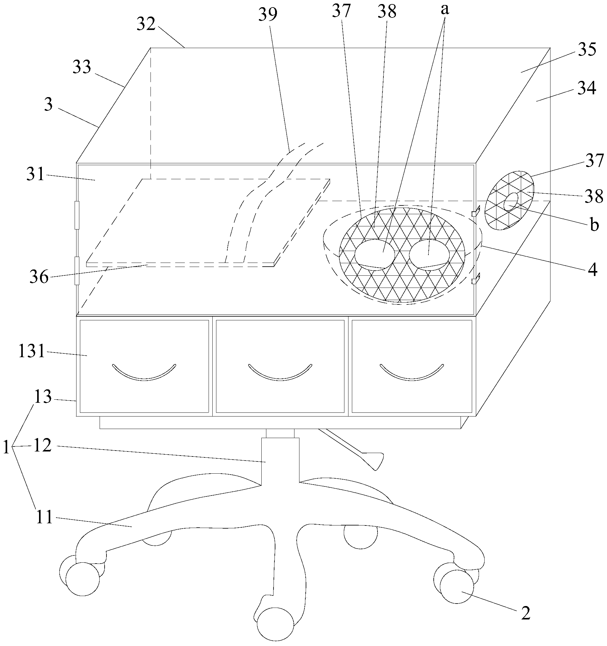 | 摘要: | 本实用新型公开了一种PICC换药箱,包括支撑座,支撑座的底部装有轮子,支撑座的顶部固定有透明换药箱,透明换药箱包括前面板、后面板、左面板、右面板和上面板,前面板的左侧铰接在左面板上,前面板的右侧扣合在右面板上,左面板的内侧连接有手前臂支撑板,前面板和右面板上均开有开口,各开口处装有橡胶圈,前面板上的橡胶圈有两个供护士的手臂伸入的操作窗,右面板上的橡胶圈有一个供病人的手臂伸入的伸入窗,伸入窗与手前臂支撑板相对并且伸入窗的下边缘与手前臂支撑板的上表面平齐。本实用新型的PICC换药箱能够获得相对无菌环境,减少了感染的机率与风险。 | ||||