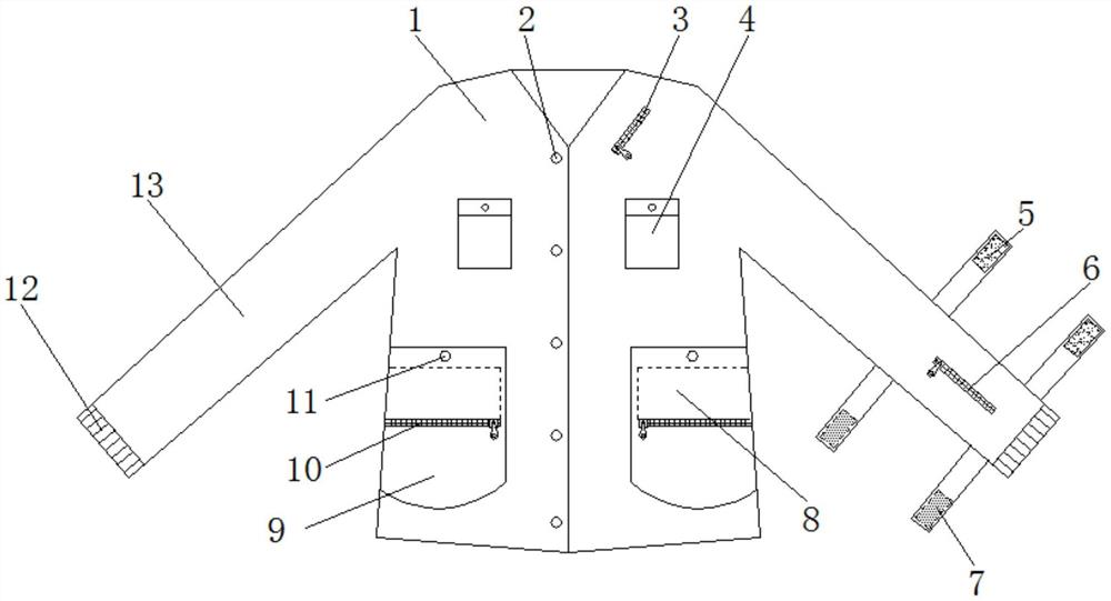 | 摘要: | 本实用新型公开了改良的病号服,包括衣体,所述衣体正表面中端的右侧设置有纽扣,所述衣体正表面两侧的底部均缝纫连接有下口袋,所述衣体内腔的前侧且位于下口袋的正后方缝纫连接有隐藏折叠袋,所述隐藏折叠袋的下方设置有第一拉链,所述衣体的正表面且位于下口袋的上方缝纫连接有口袋扣。本实用新型通过衣体、第二拉链、第一魔术贴、第二魔术贴、隐藏折叠袋、衣袖、透气布和充气囊的配合使用,具备方便悬挂引流袋的优点,解决了现有的病号服不方便在穿着的过程中悬挂引流袋,而患者在外出检查或散步时引流袋裸露在外部会使患者的隐私部位显露,从而会影响患者的自尊心,无法满足患者需求的问题。 | ||||