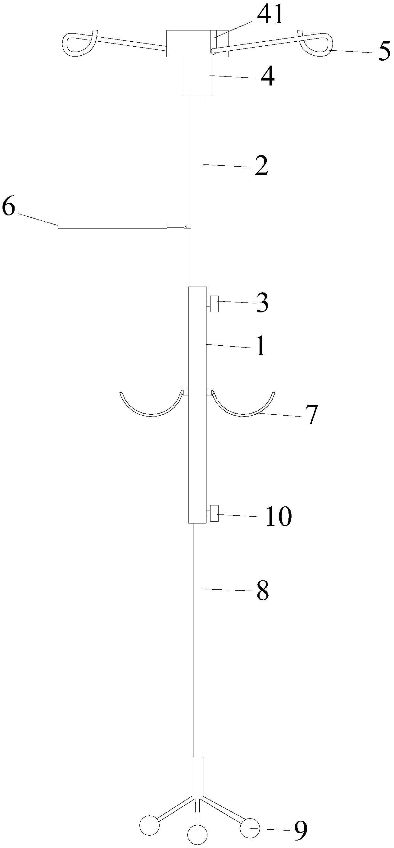 | 摘要: | 本实用新型公开了一种输液架,包括主套管和上伸缩管,上伸缩管的下端套入主套管内并且通过装于主套管上部的上伸缩调节旋钮固定,上伸缩管的上端装有若干等间隔分布的挂钩,其特征在于:所述的若干挂钩铰接安装在上伸缩管的上端并具有收拢与上伸缩管平行的第一状态和展开与上伸缩管垂直的第二状态。本实用新型的输液架可杜绝勾到病人误伤病人的隐患。 | ||||