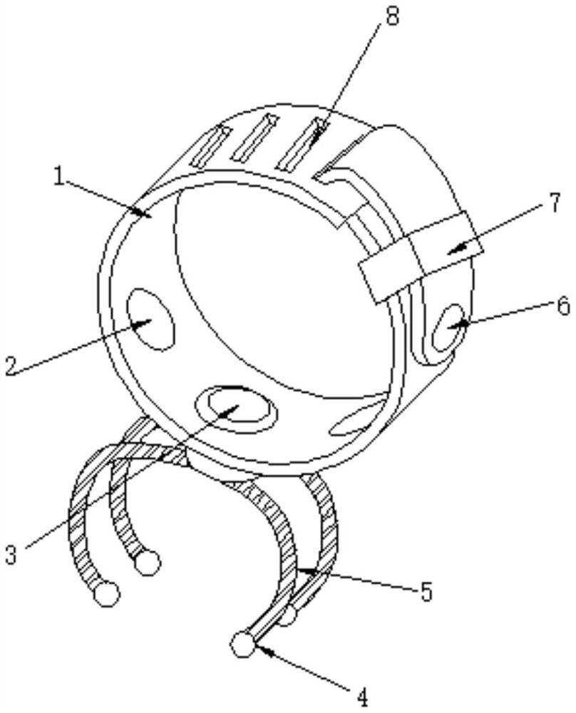 | 摘要: | 本实用新型公开了一种呼吸治疗设备管道固定装置,包括硅胶带,所述硅胶带的一端设有等距离平行分布的调节穿孔,且硅胶带的另一端内壁设有固定扣,所述硅胶带靠近固定扣的一端外壁滑动连接有收纳带环,所述硅胶带的外壁中部设有至少三个安装孔,且硅胶带位于安装孔和固定扣之间设有与固定扣适配的扣体。本实用新型分为装置固定结构和管道固定结构,装置固定结构利用硅胶带的成环内径可调,固定适用性更佳,管道固定结构利用两组万向管形成抱爪结构,可稳定固定管道,多个安装孔可安装多个连接座,可走向多个管道,管道固定结构对管道的外径适配性高,拆装便捷。 | ||||
