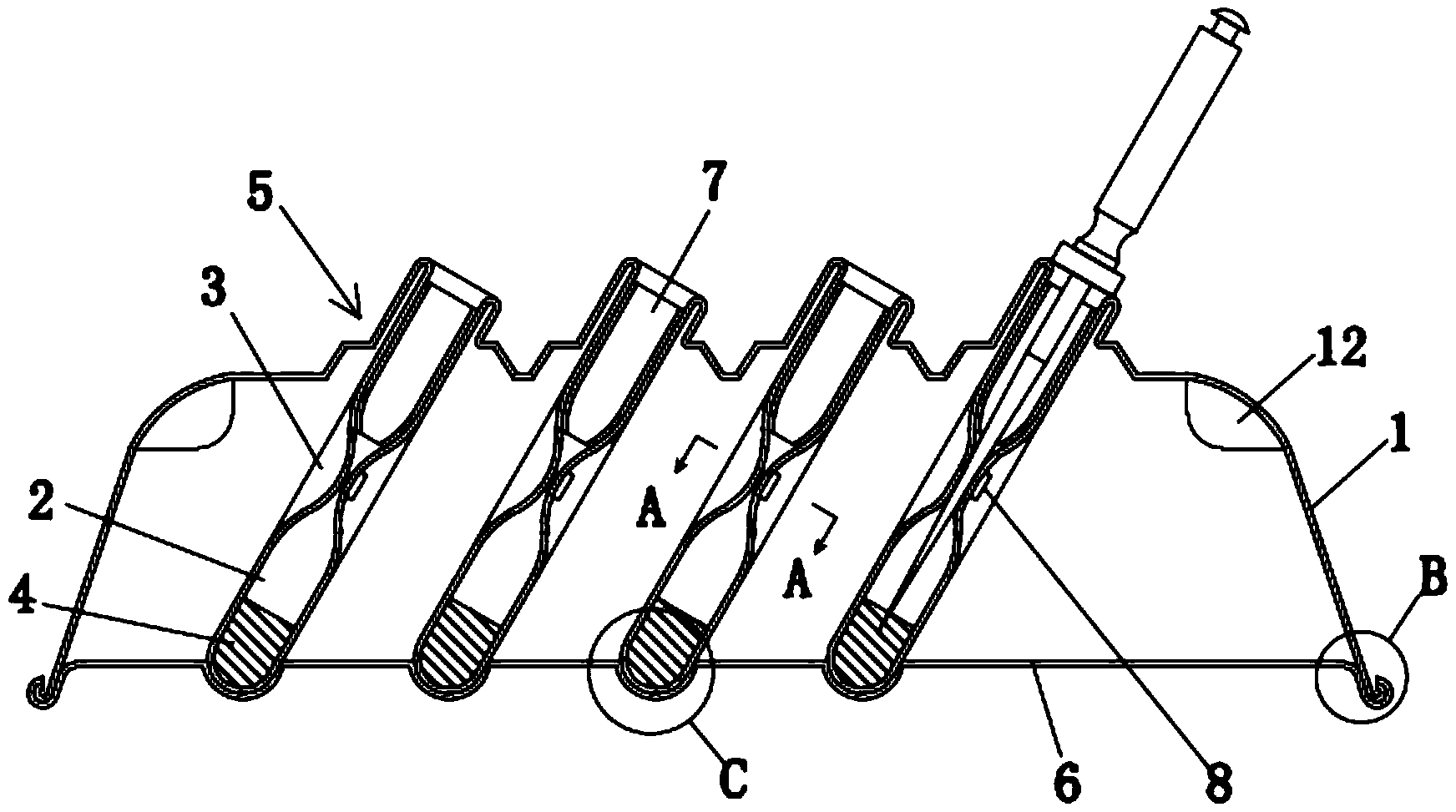 | 摘要: | 本实用新型公开了一种牙科检查盘,包括盘体,所述盘体中部设有向上凸起的平台,盘体的平台上设有倾斜布置的锐器插筒;所述锐器插筒的上端与盘体的平台连接,锐器插筒的下端封闭;锐器插筒的内侧壁上设有两个相对布置的弹性挤压部,弹性挤压部的顶部向锐器插筒的中心方向凸出,两个弹性挤压部构成锐器的防松脱结构。本实用新型提供的牙科检查盘,降低了医生被牙科锐器扎到的风险,使用更安全,而且牙科锐器放置在检查盘上时重心稳定,不容易倾倒。 | ||||