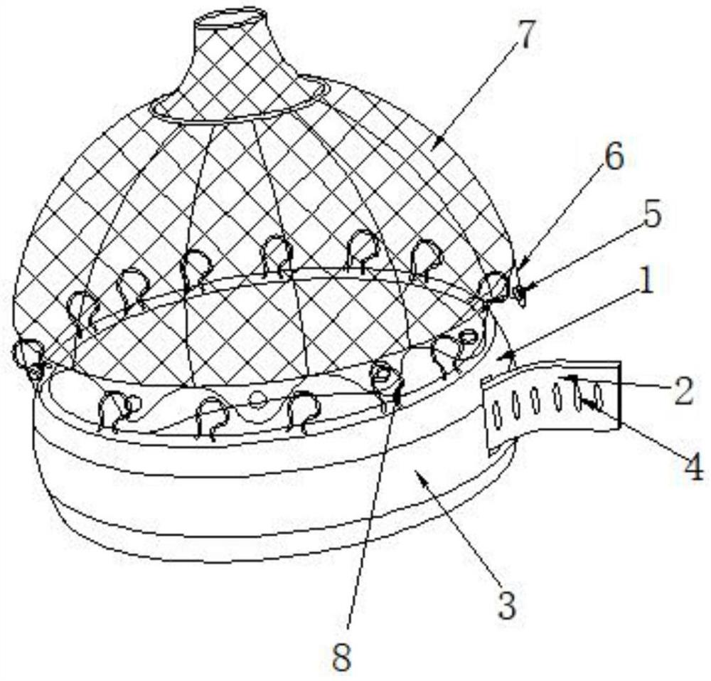 | 摘要: | 本实用新型公开了一种舒适性防水肿网帽,包括弹性发带,所述弹性发带的内壁中部设有抽拉槽,且抽拉槽的内壁抽拉连接有抽拉弹性绳,所述抽拉弹性绳的一端设有缝接边,且抽拉弹性绳通过缝接边固定连接在抽拉槽的内边上,所述抽拉弹性绳的另一端设有等距离分布的至少五个扣眼,所述抽拉弹性绳的顶端外边等距离缝接有挂绳。本实用新型通过传统网帽基础上进行升级,还设有发带,固定在前额和头围部分,利用网帽的底边设有的固定扣和发带上的挂绳相连接,保证了发带和网帽之间的连接稳定性,利用发带替代下颚带,减少前额水肿,提高佩戴舒适度。 | ||||