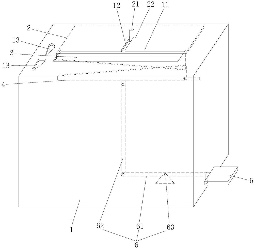 | 摘要: | 本实用新型公开了一种锐器盒,包括盒体,所述盒体的顶板上开有开孔,所述开孔为长方形孔,盒体的顶板下侧安装有沿长方形孔宽度方向滑动的可打开和关闭长方形孔的盖板,盖板的下侧面固定有沿长方形孔的长度方向布置的固定刀片,固定刀片的刀刃朝下,盒体内壁铰接有沿长方形孔的长度方向布置的活动刀片,活动刀片位于固定刀片的下方,活动刀片的刀刃朝上并与固定刀片的刀刃错位且构成切刀,位于长方形孔的长度方向一端的盒体的侧壁下部安装有脚踏板,脚踏板通过装于盒体内的连杆联动活动刀片相对固定刀片运动。本实用新型的锐器盒可杜绝处理人员受伤和感染的风险。 | ||||