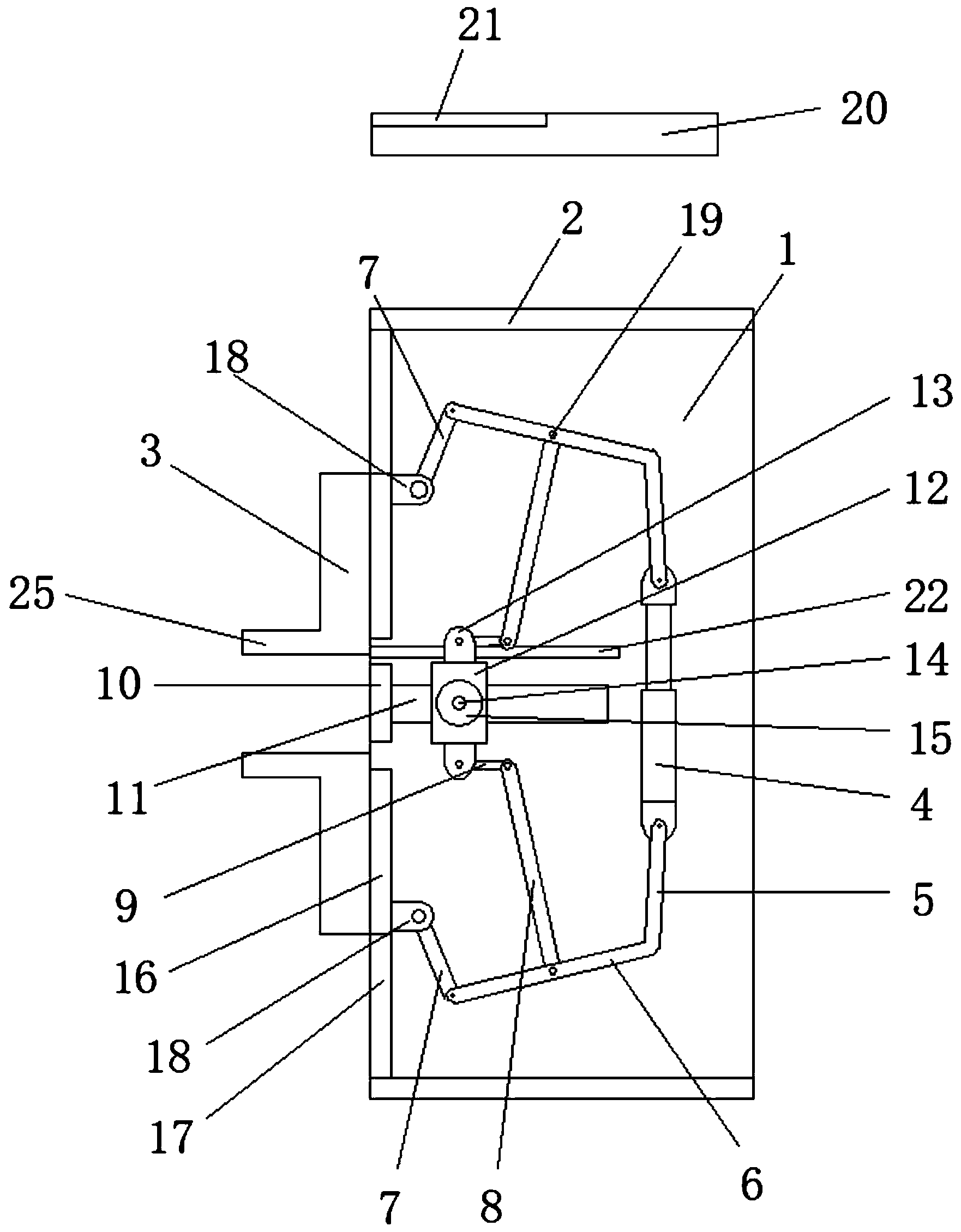 | 摘要: | 本发明公开了一种口腔护理用辅助张口装置,它包含两块平行设置的侧板(1),两块侧板(1)的上下两端分别通过顶板(2)固定连接成一体,两块侧板(1)一侧的开口处设置有上下对称设置的张口支架(3),两块侧板的内部设置有驱动张口支架(3)开合的驱动装置,两块侧板(1)的下方设置有集液装置;所述的驱动装置包含一根电动推杆(4),该电动推杆(4)的两端分别安装有与其转动连接配合的第一驱动杆(5)。本发明结构简单,能够根据患者目前的张口程度由医护人员自行调整下一阶段张口程度的护理,提高了整体的工作效率和适用性,同时在张口锻炼过程中所产生的涎水会直接流入积液盒中,便于后期的清洁工作,大大的降低了医护人员的护理强度。 | ||||