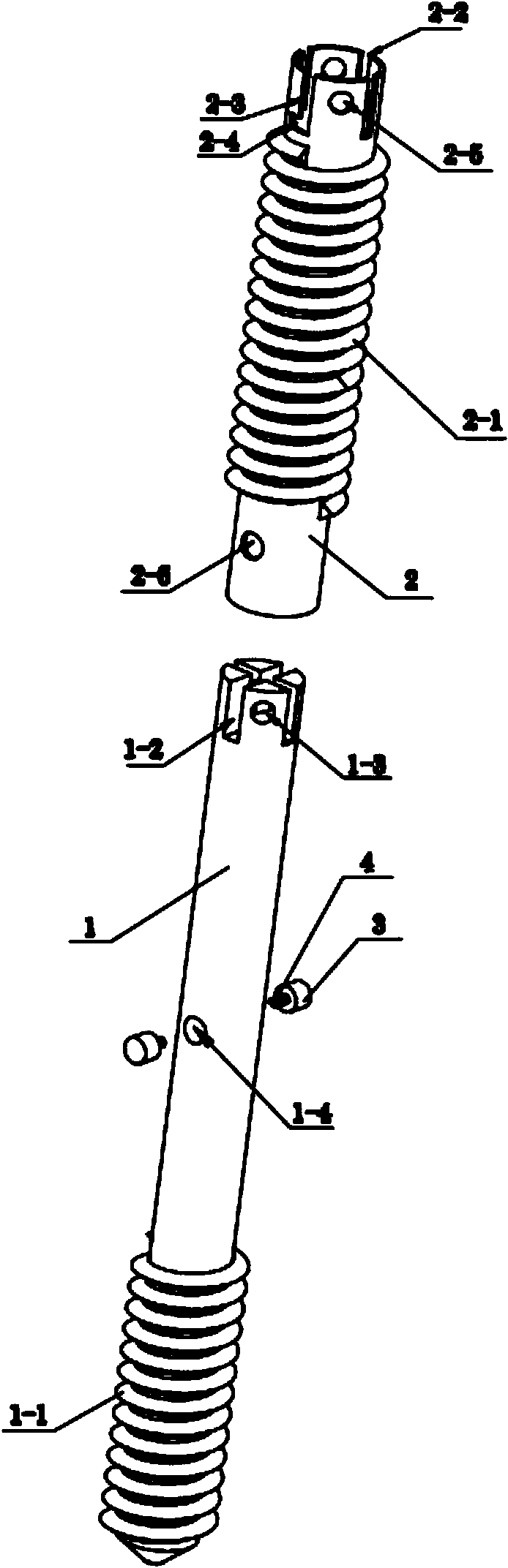 | 摘要: | 本实用新型涉及一种椎弓根延长装置,该装置由芯杆、套在芯杆上的套杆以及设在芯杆和套杆之间的锁定机构组成,其中,所述芯杆的前端以及套杆的中部设有自攻螺纹,所述套杆套在芯杆的自攻螺纹的后端的部分上;所述芯杆的后端以及套杆的后端均设有用于与螺丝刀的头部相匹配的开口,芯杆上的开口和套杆上的开口相重合;所述锁定机构由弹簧、锁定头以及锁定孔构成,其中,所述芯杆的外壁上设有安装槽,所述弹簧和锁定头设置在该安装槽内,弹簧的一端与安装槽连接,另一端与锁定头连接,所述锁定孔设置在套杆上且与锁定头相匹配。本装置具有部件少、离断操作简便、定位准确且可靠的优点。 | ||||