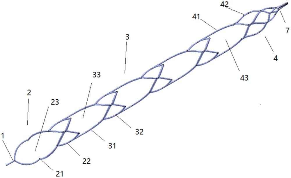 | 摘要: | 本实用新型公开了一种脑静脉取栓支架,包括支架主体,支架主体的直径与脑静脉血管的直径相适配,近端段包括第一连接部以及连接在第一连接部远端的第一网篮,第一连接部上设有第一血栓入口,第一连接部的筋条向外径方向凸出;中部段由多个取栓环套依次连接而成,每个取栓环套均包括位于近端的第二连接部以及连接在第二连接部远端的第二网篮,第二连接部上设有第二血栓入口;远端段包括第三连接部以及连接在第三连接部远端的挡篮,第三连接部上设有第三血栓入口;本申请可用于脑静脉取栓,通过沿支架主体长度方向依次设置第一血栓入口、第二血栓入口和第三血栓入口,随着支架主体的拖拽,血栓可由任一血栓入口进入支架主体内,提高取栓效果。 | ||||