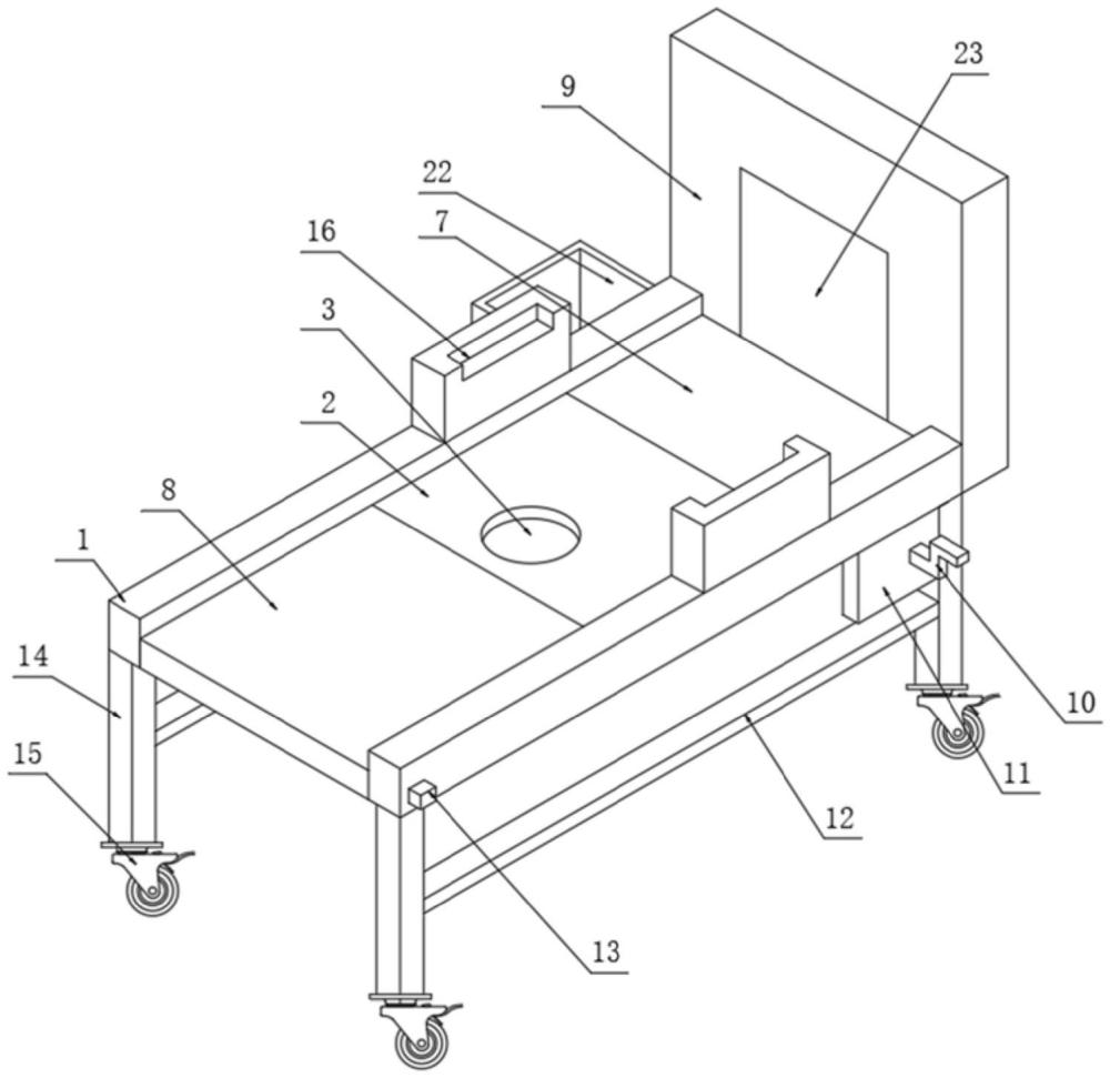 | 摘要: | 本实用新型涉及医疗器械技术领域,具体为一种胃肠外科术后卧床装置,包括两个床架,两个所述床架的右表面共同固定连接有床头,所述床头的内壁转动连接有门,所述门的右表面设有锁扣,所述两个床架的相反一面均螺纹连接有螺栓,两个所述床架的相对一面共同固定连接有坐垫,所述坐垫的上表面开设有下污口,所述坐垫的下表面固定连接有下污口相配合的收污箱,所述坐垫的左表面转动连接有脚垫,该卧床装置通过设置的一系列结构使其能够很方便的对长时间不能起床的病人进行清洁身体的功能,并且可以让病人能够很方便的进行排泄粪污,从而使陪护人员照顾病人时既方便,又减轻了工作量。 | ||||