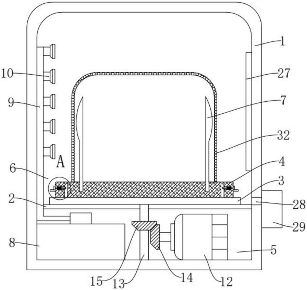 | 摘要: | 本实用新型公开了一种医疗手术刀用消毒机,包括消毒机外壳、支撑隔板、旋转支撑板、消毒板、驱动结构、卡合结构、手术刀、蒸汽发生器、蒸汽管路和蒸汽喷头,所述消毒机外壳为前侧面开口的腔体结构,所述支撑隔板设于消毒机外壳内,所述旋转支撑板转动设于支撑隔板上,所述消毒板放置于旋转支撑板上,所述驱动结构设于消毒机外壳内底壁,所述卡合结构设于消毒板侧壁,所述消毒板上设有安装槽,所述手术刀滑动设于安装槽内,所述蒸汽发生器设于消毒机外壳内底壁,所述蒸汽管路设于消毒机外壳内侧壁。本实用新型涉及医疗设备技术领域,具体提供了一种结构合理、简单,可均匀充分对刀具进行蒸汽消毒,同时方便取出和放入刀具的医疗手术刀用消毒机。 | ||||