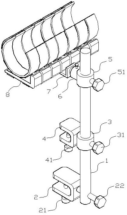 | 摘要: | 本实用新型涉及术肢抬高领域,尤其涉及一种术肢抬高角度调整支架,该支架可解决背景技术中提出的支撑板为一体结构,不能根据患者手臂调整支撑位置,且绑带为一处,不能调节绑带固定手臂的位置的问题。包括立杆,立杆底部左侧设有第一固定架,立杆下端部从右向左旋拧贯穿有调节螺栓;第一固定架上侧的立杆上可旋转设有第一套环,第一套环右侧向内旋拧有第一限位螺栓,第一套环左侧固定设有第二固定架;第一套环上侧的立杆上可旋转套设有第二套环,第二套环右侧向内设有第二限位螺栓,第二套环左侧通过可旋转的连接件与第一拐角支板的第一竖板右侧面固定连接,第一拐角支板第一横板上侧固定设有支撑件。它操作简单,使用方便,适用于多种患者。 | ||||