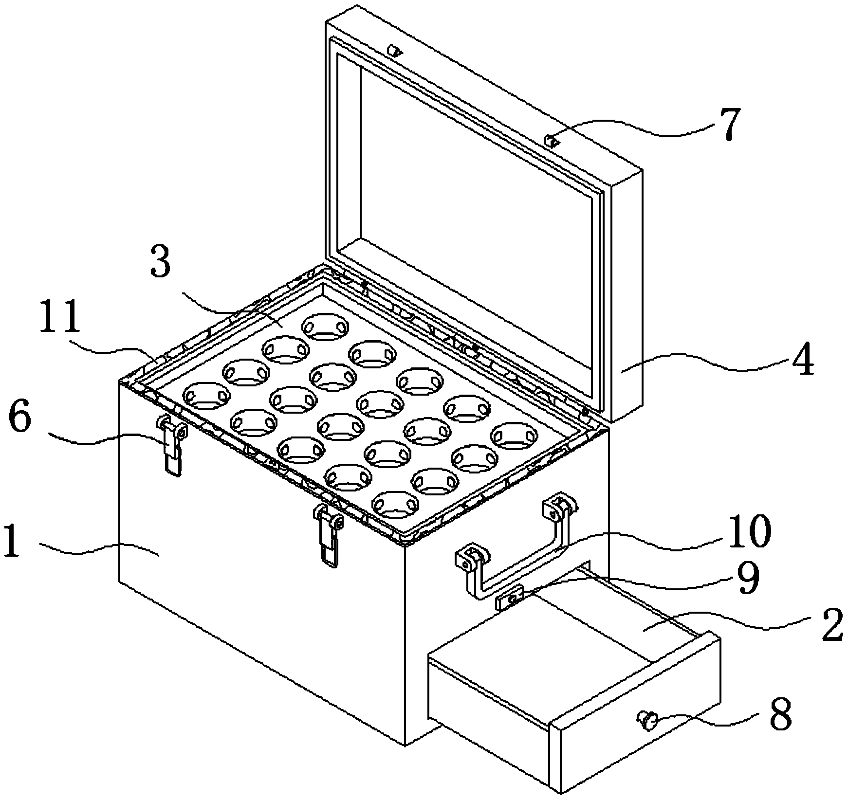 | 摘要: | 本实用新型公开了一种冷藏试管盒改良结构,包括盒体、置物抽屉和试管架,所述盒体的一侧通过合页活动连接有盒盖,所述盒体外侧面的底部开设有安装槽,所述安装槽的内部抽拉有置物抽屉,所述盒体靠近置物抽屉的内壁固定连接有固定块。该冷藏试管盒改良结构,通过试管架的设置,可以将需要冷藏的试管由试管插孔插入,试管的底端会接触到放置孔的表面,能够将试管稳定在试管架上,弹性卡块可以将试管固定在试管插孔内,避免在移动时与顶板发生碰撞,通过置物抽屉的设置,可以用于放入冰块等冷凝剂,使盒体内的温度降低,达到冷藏试管的作用,通过抽拉的方式,更加方便更换放入置物抽屉内的冰块等冷凝剂。 | ||||
