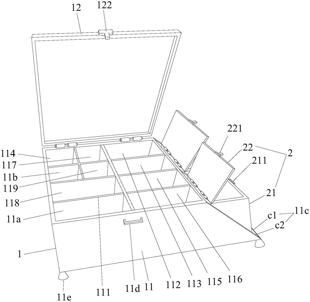 | 摘要: | 本实用新型公开了一种生命体征测量盒,包括收纳盒一,包括盒体一和盖在盒体一上端敞口处的盒盖一,盒体一通过纵向及横向的隔板一分隔为听诊器容纳槽、手电筒容纳槽、体温计容纳槽、血氧饱和度监测仪容纳槽、血压计容纳槽、手消毒剂容纳槽、一次性薄膜手套容纳槽、一次性乳胶手套容纳槽、血糖仪及配套物容纳槽和酒精容纳槽,盒体一的右侧有沿前后方向并列布置且顶部和右侧均敞口的两个敞口盒;及两个分别收纳医疗垃圾和锐器的收纳盒二,两个收纳盒二分别放置在相应的敞口盒内,收纳盒二包括盒体二和盖在盒体二上端敞口处的盒盖二。本实用新型的生命体征测量盒提高了工作效率。 | ||||