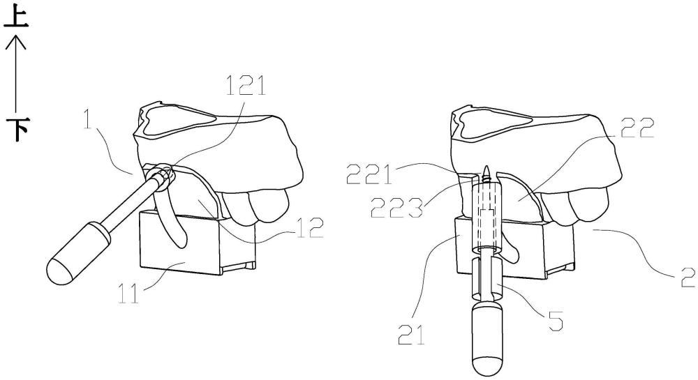 | 摘要: | 本发明公开了一种支抗钉辅助植入装置,包括定位导板、植入导板和限深卡环,其中,定位导板1用于辅助医生打入预钻孔,植入导板2用于限定支抗钉的植入角度,限深卡环5用于限制支抗钉的植入深度。本发明通过将牙龈软组织信息和牙齿硬组织信息结合,增加了支抗钉导板的软组织贴合度;通过定位导板和预钻孔来确定预钻孔位置,减少了支抗钉滑脱和折断的风险,并提升了支抗钉植入位点的精确度;通过植入导板上的导向管限定支抗钉的植入角度,减少植入角度发生偏差而产生的损伤牙根的风险,提升了支抗钉植入过程的安全性;通过限深卡环,限制了支抗钉植入的深度,可实现支抗钉的双层皮质骨精准植入,提升了支抗钉植入后的稳定性。 | ||||