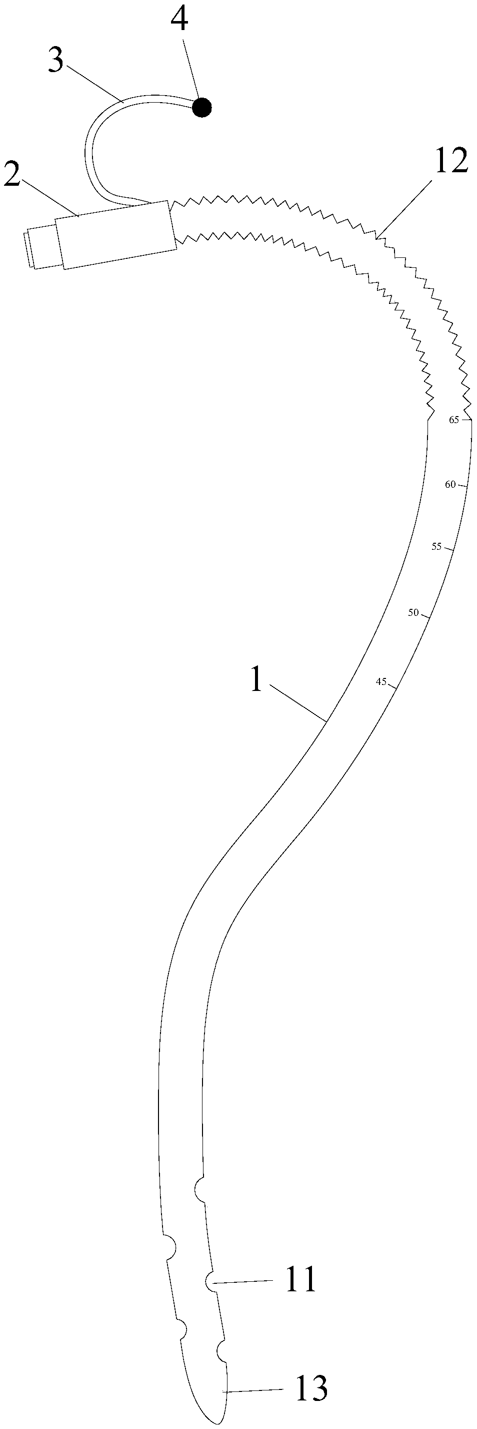 | 摘要: | 本实用新型公开了一种胃管,包括胃管主体,胃管主体的下端开设有侧孔,胃管主体的上端装有接头,所述胃管主体上从距下端65cm处至接头下端位置之间是波纹伸缩管结构,伸长后的长度是缩短后的长度的两倍,在接头位置固定有挂耳扣,挂耳扣的末端外围固定有防压疮棉球。本实用新型的胃管长度能够缩短并且能固定在一侧耳朵上,解决了脱管问题,避免重新插胃管,减少医护人员的工作量。 | ||||