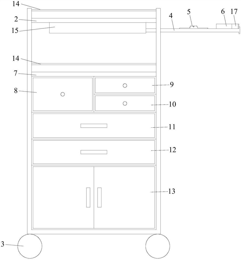 | 摘要: | 本实用新型公开了多功能仪器架,包括仪器架主体,仪器架主体的上部为监护仪放置板,监护仪放置板的下方有输液泵放置板,输液泵放置板的下方有从上至下依次分布的血压导线抽屉和血压袖带抽屉,仪器架主体的底部有滚轮,所述监护仪放置板的下侧安装有可朝右推拉的书写板,书写板上固定有卡纸夹及位于卡纸夹旁的置笔盒,书写板位于输液泵放置板的上方,输液泵放置板的下方左侧为呼吸气囊抽屉、右侧为上下分布的药物抽屉和杂物抽屉,杂物抽屉和呼吸气囊抽屉位于血压导线抽屉的上方,血压袖带抽屉的下方有尿片柜。本实用新型的多功能仪器架方便书写记录,分类放置新生儿使用的仪器和用品,使得取用更方便,提高工作效率。 | ||||