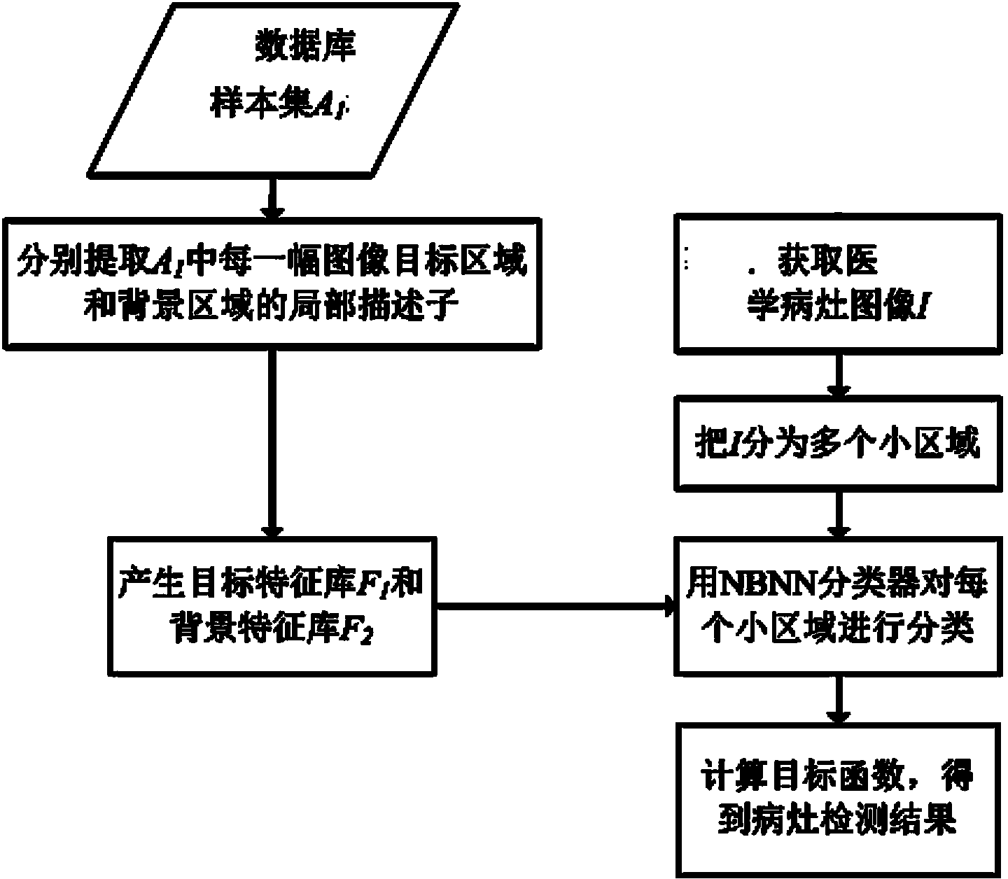 | 摘要: | 一种局灶性病灶的非参数自动检测方法,预先以已经勾画好病灶的医学病灶图像作为样本构建样本集A1数据库,分别提取样本集A1中每一幅图像的目标区域和背景区域的局部描述子,得到样本集A1中所有目标区域局部描述子组成的目标特征库F1和样本集A1中所有背景区域局部描述子组成的背景特征库F2;处理时具体包括下列步骤:(1)将待处理的医学病灶图像I分为多个子区域;(2)用NBNN分类器对每个子区域进行分类;(3)计算目标函数,得到病灶检测结果。本发明不需预先建立参数化模型,且不需要对图像局部描述子进行量化,应用灵活,图像局部描述子鉴别能力强,能精确检测局灶性病灶。 | ||||