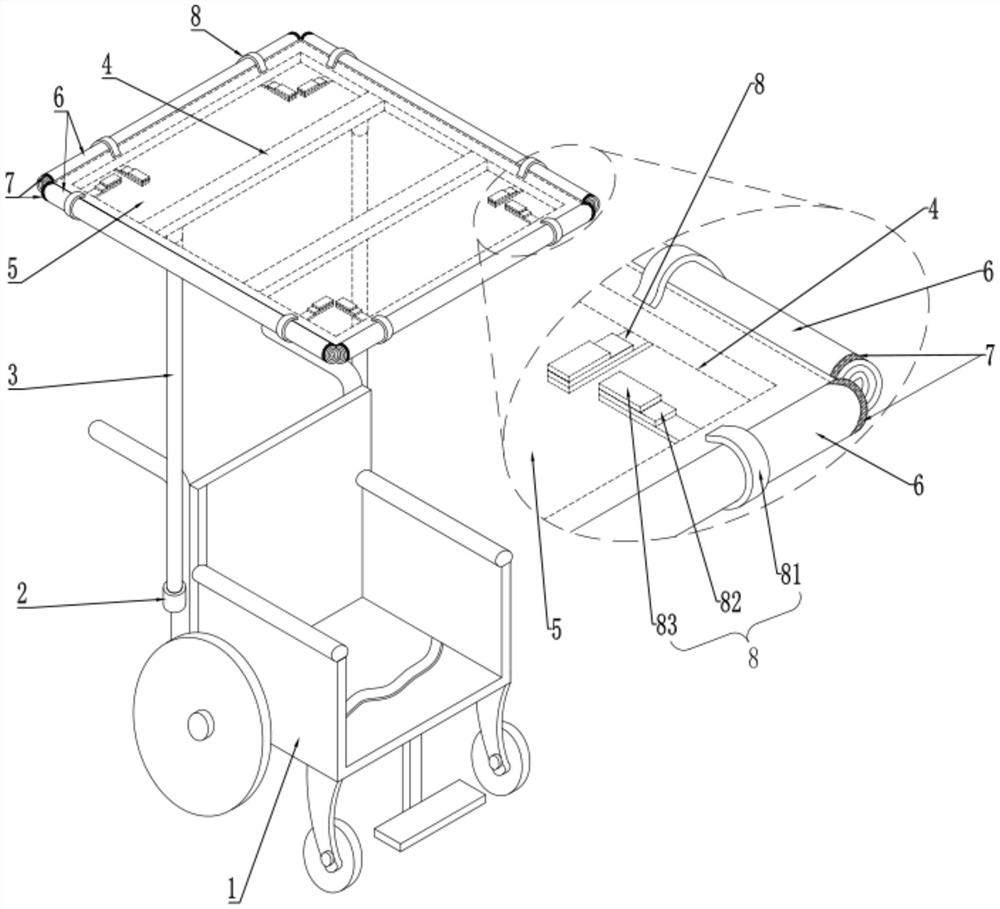 | 摘要: | 本实用新型公开了一种遮阳防雨轮椅,包括轮椅本体;在所述轮椅本体的靠背端两侧均通过一安装座可拆卸设有支撑杆,在所述支撑杆的顶部可拆卸设有支撑架,在所述支撑架上可拆卸设有一工作时能够罩住所述轮椅本体的罩布,在所述罩布的四端均设有一能够收起和放下的幕帘且各所述幕帘相互之间均通过一拉链连接,其中,所述幕帘收起时与所述罩布配合形成一个遮挡所述轮椅本体上方的平面结构,所述幕帘放下时与所述罩布、拉链配合形成一个笼罩所述轮椅本体的罩体结构。本实用新型具有使用方便、能够为病人进行遮阳挡雨并且遮阳挡雨效果好的优点。 | ||||