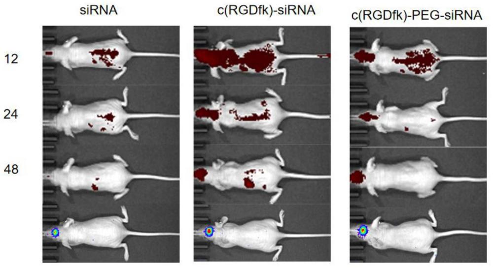 | 摘要: | 本发明涉及生物技术领域,特别的涉及一种针对肿瘤生长因子受体的pH响应性的siRNA递送系统。本发明的递送系统包括由多肽衍生物修饰的正义链ssRNA和PEG衍生物修饰的反义链asRNA所形成的分子;本发明的递送系统中多肽为c(RGDfK),PEG衍生物修饰的反义链asRNA由甲氧基聚乙二醇丙醛(mPEG‑CHO)分子、偶联分子和asRNA连接反应而成,mPEG‑CHO中的PEG分子量为500‑20000,mPEG‑CHO与偶联分子之间形成腙键,偶联分子包括8‑氨基‑3,6‑二氧杂辛酸、4‑(苄基氨基)苯甲酰肼、N‑马来酰基‑β‑丙氨酸、3‑马来酰亚胺基丙酸中的一种或多种。该递送系统能够延长siRNA的体内循环时间,同时抑制siRNA在肾脏的代谢累积,提高肿瘤靶向递送效率,从而更好地实现siRNA的沉默效应。 | ||||