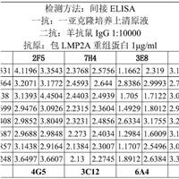 本发明公开了抗EB病毒LMP2A的单克隆抗体及其细胞株和应用,本发明以SEQ ID NO.2序列为抗原采用细胞融合得到细胞株,经过三轮亚克隆挑选,结合间接ELISA及FACS检测技术,最终筛选出可稳定分泌阳性抗体的杂交瘤细胞株,扩大培养,细胞上清经亚型鉴定结果显示均为单一亚型;FACS检测结果较好的细胞6A46D2制备腹水并纯化出抗体。分泌的抗体具有高特异性和高亲和力,而且建立的间接ELISA方法具有很好的检测特异性和灵敏度,说明本发明...