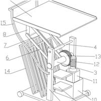 本实用新型公开了一种手术室护理托盘架:包括底部支撑架体,底部支撑架体上设有立柱体;立柱体的中上部转动设有下部核心轴体,立柱体的顶部固定设有上部核心轴体,下部核心轴体固定设有下部架体,下部核心轴体上转动设有上部架体,下部架体的末端和上部架体的末端转动设有侧部板体,侧部板体上设有托盘架架体,减速电机上固定设有蜗杆,下部核心轴体上固定设有蜗轮,蜗杆和蜗轮相互配合,使用者便于调整托盘架架体的高度;使用控制器控制减速电机转动,实现让上部核心轴体转...